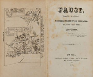 roulette à froid (Reliure de l'époque). Vicaire, III-1014 /// XII-312. Édition originale de la traduction de Gérard de Nerval, illustrée d'un frontispice par Pineas. Notre exemplaire est enrichi de la suite de 26 planches gravées par Branche (13) et Trueb (13) d'après les dessins de Retzsch qui fut publiée séparément chez Audot en 1828. Joli exemplaire contenant d'inévitables rousseurs.