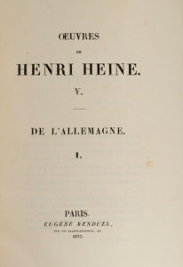 Henri HEINE. De l'Allemagne. Paris, Eugène Renduel, 1835. 2 volumes in-8, demi-maroquin bleu à long grain à coins, dos lisses ornés en long, couverture (Canape). Vicaire, IV-55 /// I. (2f.)-XIII-328 / II. (2f.)-316-(1f.). Édition originale de la...