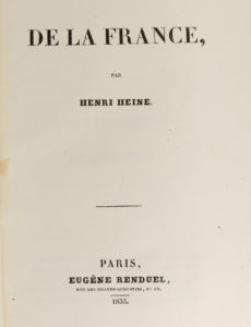 Henri HEINE. De la France. Paris, Eugène Renduel, 1833. In-8, bradel demi-maroquin bordeaux à coins, dos à 4 faux nerfs orné, couverture (Carayon). Vicaire, IV-54 /// (2f.)-XXIX-347. Édition originale de la traduction française. Bel exemplaire,...