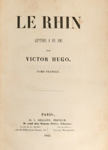 Victor HUGO. Le Rhin. Paris, H. L. Delloye et Garnier, 1842. 2 volumes in-8, demi-basane maroquinée bleue, dos lisses ornés, tranches dorées (Reliure de l'époque), étui postérieur. Carteret, I-412 / Vicaire, IV-298 /// I. (2f.)-XXX-(1f.)-368 /...