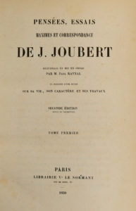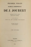 Joseph JOUBERT. Pensées, essais, maximes et correspondance... Paris, Veuve Le Normant, 1850. 2 volumes in-8, demi-basane rouge, dos lisses ornés (Reliure de l'époque). Lh., 332 / Vicaire, IV-585 /// I. (2f.)-464 / II. (2f.)-379. Seconde édition,...