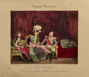 Delpech d'après les dessins de Henry Monnier. La suite doit contenir un titre qui manque ici. Exemplaire avec les planches mises en couleurs à l'époque. Pièce de titre au dos grattée.