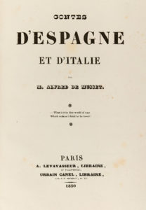 Alfred de MUSSET. Contes d'Espagne et d'Italie. Paris, A. Levavasseur et Urbain Canel, 1830. In-8, demi-basane bleue, dos lisse orné (Reliure de l'époque). Carteret, II-188 / Lh., 447 / Vicaire, V-1238 /// VIII-238. Édition originale de ce recueil...