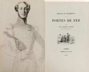 nerfs richement orné, dentelle intérieure (Capé). Olivier, pl. 2580, fer n° 4 / Vicaire, VI-140 /// (2f.)-XVI-329. Édition originale et premier tirage des 200 illustrations de Raffet, Decamps et Dauzats gravées sur bois par Brevière, Hébert, Lavoignat, Lavieille, etc., et une carte dépliante. L'illustration se compose de 160 vignettes dans le texte et de 40 planches hors texte, tirées sur Chine monté, chacune avec serpente légendée. Cette très belle publication fut confiée à l'Imprimerie Royale. Les exemplaires étaient destinés aux membres de la famille royale, aux dignitaires de l'État et à tous les participants à l'expédition. Les exemplaires sont reliés en cartonnage crème, en chagrin ou en maroquin rouge avec fers spéciaux. Bel exemplaire de présent tiré pour M. Brun d'Aubignosc, officier d'ordonnance du roi. Il est relié au chiffre couronné de Ferdinand-Philippe-Louis, duc d'Orléans, fils aîné de Louis-Philippe et de la reine Marie-Amélie. Né en 1810 et duc de Chartres d'abord, il prit le titre de duc d'Orléans en 1830 à l'avènement de son père au trône. Il participa à la conquête de l'Algérie où il resta jusqu'en 1841. Il mourut tragiquement en 1842 en sautant de sa voiture dont les chevaux s'étaient emballés. Le fer frappé sur le volume est très proche de celui reproduit par Olivier à la planche 2580 sous le numéro 4. L'exemplaire est en outre enrichi d'un portrait du duc d'Orléans gravé par Calamatta d'après Ingres et d'un feuillet volant comportant des croquis originaux à la mine de plomb de Raffet. Des bibliothèques Descamps-Scrive (ex-libris, II-1925, n° 286) et Roudinesco (ex-libris, I-1967, n° 99).