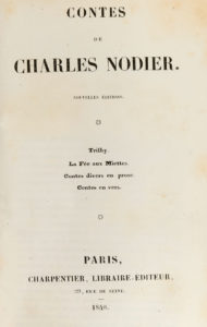 nouvelles et mélanges publiés par Ladvocat, Gide et Ponthieu de 1820 à 1822. Trilby en forme le sixième et dernier volume. Dos et mors un peu frottés ; rousseurs, manque les 3 feuillets d'annonce de libraire, pâle mouillure en pied des premiers feuillets. On joint NODIER. Contes. - Nouvelles. - Romans. Paris, Charpentier, 1840. Ensemble 3 volumes in-12, demi-veau rouge, dos à 4 nerfs ornés de filets dorés et à froid (Simier). Vicaire, VI-123, 138 /// (2f.)-540 / (2f.)-494-(1f.) / (2f.)-394-(1f.). Réunion d'oeuvres de Charles Nodier, publiées pour la première fois au format in-12 par Charpentier. Ensemble contenant pour les contes : Trilby et La Fée aux Miettes, ainsi que divers contes en vers et en prose ; pour les nouvelles : Souvenirs de jeunesse, Mademoiselle de Marsan, Inez de las Sierras et La Neuvaine de la Chandeleur ; et pour les romans : Jean Sbogar, Le Peintre de Salzbourg, Les Méditations du Cloître, Adèle et Thérèse Aubert. Bel ensemble uniformément relié par Simier, malgré les dos passés et un petit manque à une coiffe ; quelques pâles rousseurs.