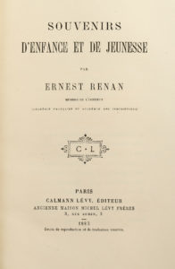 Ernest RENAN. Souvenirs d'enfance et de jeunesse. Paris, Calmann-Lévy, 1883. Grand in-8, maroquin janséniste marron, dos à 5 nerfs, doublure de maroquin vert lierre, gardes de soie verte, tranches dorées sur témoins, étui (Semet et Plumelle)....