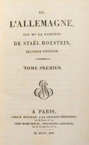 Germaine de STAËL-HOLSTEIN. De l'Allemagne. Paris, Nicolle et Mame, 1814. 3 volumes in-8, demi-veau blond, dos lisses ornés (Reliure de l'époque). Vicaire, VII-653 /// I. (2f.)-XVI-348 / II. (2f.)-387 / III. (2f.)-415. Seconde édition française....