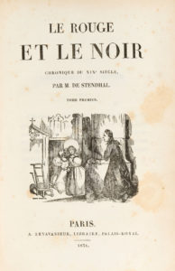 STENDHAL. Le Rouge et le noir. Chronique du XIXe siècle. Paris, A. Levavasseur, 1831. 2 volumes in-8, demi-veau rouge, dos à 4 nerfs ornés, étui moderne (Reliure de l'époque avec les dos modernes pastiches). Carteret, II-354 / Lh., 568 /...
