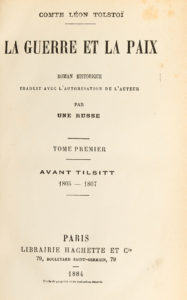 Léon TOLSTOI. La Guerre et la paix. Roman historique traduit avec l'autorisation de l'auteur par une russe. Paris, Hachette, 1884. 3 volumes in-12, bradel demi-percaline bleue, couverture (Reliure de l'époque). Vicaire, VII-850 /// I. (2f.)-462 /...