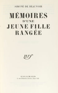 Simone de BEAUVOIR. Mémoires d'une jeune fille rangée. - La Force de l'âge. - La Force des choses. - Tout compte fait. Paris, NRF, 1958-1972. 4 volumes in-8, demi-chagrin violet à coins, dos à 5 nerfs, têtes dorées, couvertures et dos (Reliure...