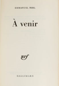 Emmanuel BERL. A venir. Paris, NRF, 1974. In-8, demi-chagrin rouge à coins, dos à 5 nerfs, tête dorée, couverture et dos (Reliure de l'époque). Lh., 82 /// 145-(2f.). Édition originale. Un des 20 exemplaires sur vélin pur fil (n° 1), seul...