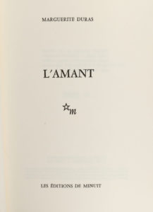 Marguerite DURAS. L'Amant. Paris, Éditions de Minuit, 1984. In-8, demi-chagrin rouge à coins, dos à 5 nerfs, tête dorée, couverture et dos. Lh., 231 /// 142-(3f.). Édition originale. Un des 99 exemplaires sur vélin d'Arches (n° 14), seul...