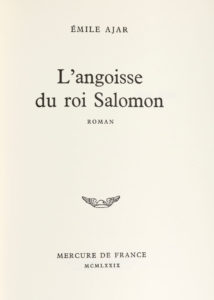 [Romain GARY]. Émile AJAR. L'Angoisse du Roi Salomon. Paris, Mercure de France, 1979. In-8, demi-maroquin rouge à coins, dos à 5 nerfs, tête dorée (Reliure de l'époque). Lh., 264 /// 242-(4f.). Édition originale. Un des 45 exemplaires de tête...