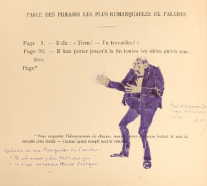 exemplaires sur Hollande antique (n° 318), celui-ci enrichi à l'avant-dernier feuillet d'un portrait-charge à l'encre violette d'une main non identifiée, avec les mentions Etat idio (oh combien) syncra… sique du soussigné, après lecture. H.M. et Opinion de ma Bourgeoise sur l'auteur : / « Il est encore plus fuit sec que / ne l'est monsieur Henri Becque ». Petites éraflures au dos.
