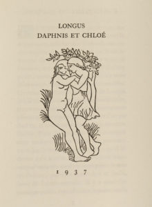 LONGUS. Daphnis et Chloé. Paris, Philippe Gonin, 1937. In-8, en feuilles, couverture illustrée, chemise et étui modernes. (1f.)-217-(2f.). Traduction de Jacques Amyot revue et complétée par Paul-Louis Courier. 47 bois originaux d'Aristide...