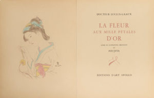 Docteur LUCIEN-GRAUX. La Fleur aux mille pétales d'or. Paris, Éditions d'art Apollo, 1930. In-4, broché. Monod, II-7479 /// 59-(2f. dont un blanc). 5 compositions hors texte de Tsugouharu Foujita gravées en taille-douce et coloriées à...