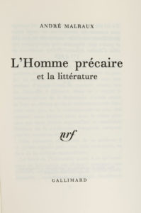 André MALRAUX. L'Homme précaire et la littérature. Paris, NRF, 1977. In-8, broché, chemise demi-chagrin rouge et étui. Lh., 390 /// 330-(3f.). Édition originale. Un des 170 exemplaires de tête sur Hollande (n° 55). On joint : MALRAUX. Le...