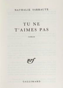 Nathalie SARRAUTE. Tu ne t'aimes pas. Paris, NRF, 1989. In-8, broché. Lh., 553 /// 216-(1f.). Édition originale. Un des 60 exemplaires sur vélin de Rives (n° 24), seul grand papier. On joint : Robert PINGET. L'Ennemi. Paris, Éditions de Minuit,...