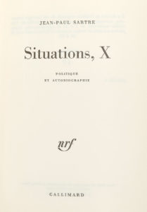 Jean-Paul SARTRE. Situations, X politique et autobiographie. Paris, NRF, 1976. In-8, demi-maroquin rouge à coins, dos à 5 nerfs, tête dorée, couverture et dos (Reliure de l'époque). 226-(3f.). Édition originale. Un des 35 exemplaires de tête...