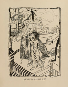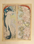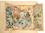 Feure se composant d'une couverture en couleurs, d'un frontispice également en couleurs avec parties mobiles formant un triptyque, un titre en noir, 15 planches hors texte en noir, 30 encadrements de texte dont 15 répétés, 18 culs-de-lampe et 3 ornements pour la justification, la table et l'achevé d'imprimer. Tirage à 220 exemplaires sur Japon (n° 198). Très bel exemplaire malgré la reliure en partie insolée.