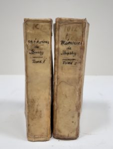 BUSSY-RABUTIN Roger (de) : Mémoires du comte de Bussy-Rabutin. Chez Jean Anisson, Paris 1697. Complet du frontispice, petits manques en bordures ne nuisant pas à l'illustration. Complet des deux volumes, chacun relié plein veau crème, dos lisse,...