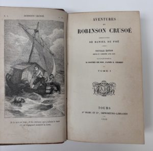 titres et le début du texte, est contrecollé un article de Charles Galtier sur le bicentenaire de Robinson Crusoe. Deux volumes reliés à l'identiques, demi basane blond, dos lisse orné de dorure, pièces de titre et tomaison sur cuir rouge, tête dorée, intérieur frais.