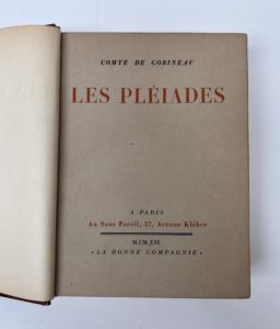 GOBINEAU Arthur Comte de : Les pléiades. Ed. Au sans pareil Paris 1821. L'un des 10 exemplaires de tête sur Japon, le n°9. Reliure in-8 plein basane, dos lisse orné de dorures, pièce de titre sur cuir aubergines, tête dorée, couvertures et dos...