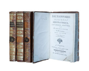 LA FOSSE : Dictionnaire raisonné d'hippiatrique (cavalerie, manège et maréchallerie). Chez Boudet Libraire Paris 1775. Ensemble complet en 4 tomes reliés plein veau marbré, dos orné et pièces de titre, trois tranches mouchetées. Manque en...