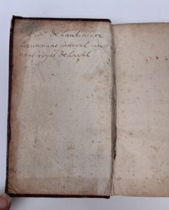Mention manuscrite “A Mr de Laubiniere lieutenant général au siège royal de Laval”. Reliure in-12 pleine basane marron, dos à 5 nerfs, orné de dorure, pièce de titre sur cuir rouge, dos assombri, trace de frottement avec manque en coiffe et en queue de dos, trois tranches jaspées, intérieur frais.