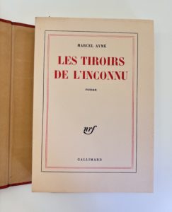 AYME Marcel : Les tiroirs de l'inconnu. Gallimard Paris 1960. E.O. L'un des 50 ex. de tête sur Hollande. Broché in-8, état de neuf, sous chemise et étui demi maroquin orangé, dos à 5 Nerfs, étui gainé du même cuir (infime accroc en tête de...
