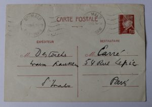 trompais j'en mourrai ! Je meurs ! Nous mourrons !”. La carte est datée, d'après le tampon de la poste, du “28.VIII.43”, le tampon de la poste est à l'effigie du Maréchal Pétain.