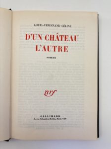CELINE Louis-Ferdinand : D'un château l'auteur. 1957. E.O. L'un des ex. sur vélin labeur relié d'après une très belle maquette de Paul Bonet. Cartonnage in-8, complet du rhodoïd, bel état général.