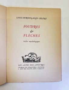 CELINE Louis-Ferdinand : Foudres et flèches (ballet mythologique). Editions les actes des apôtres Paris 1948. E.O. L'un des 925 ex. sur vélin d'Artois, 2ème papier. Broché in-8, dos jauni.