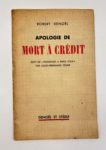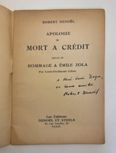 CELINE Louis-Ferdinand : Hommage à Emile Zola. In Robert Denoël, Apologie de Mort à crédit. Denoël et Steele Paris 1936. E.O. sur papier d'édition. Envoi de Denoël au libraire et écrivain René Louis DOYON. Plaquette in-12, couverture jaunie.