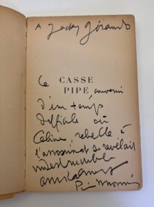 CELINE Louis-Ferdinand : Casse-pipe. Editions Frédéric CHAMBRIAND Paris 1949. E.O. en S.P. sur papier d'édition. Bel envoi pleine page de Pierre MONNIER (Chambriand) à Jacky GIRAUDO. Bien complet du bandeau publicitaire. Broché in-12, couverture...