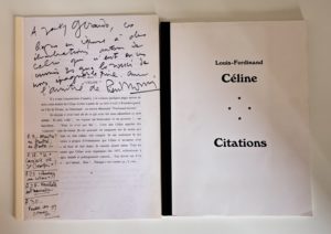 d'élucubrations écrites sur son livre Ferdinand furieux. Passionnant. Joint un tapuscrit d'un recueil de citations de CELINE collectées par Pierre Monnier.