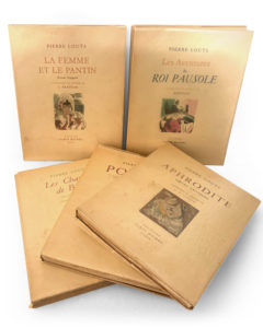 couverture rempliée en page de garde. Intérieur frais. - Aphrodite. Edition illustrée par J.A. CANTE - Les chansons de Bilitis. Edition illustrée par Louis ICART - La femme et le pantin. Edition illustrée par J. TRAYNIER (quelques rousseurs intérieures) - Les aventures du roi Pausole. Edition illustrée par BEUVILLE (piqûres sur les 8 dernières pages) - Poèmes. Edition illustrée par Berthomme de SAINT-ANDRE. (quelques rousseurs en marge mais frais dans l'ensemble). Cinq volumes brochés in-8 sous une chemise commune au dos jauni avec petite trace de mouillures. Manque l'étui.
