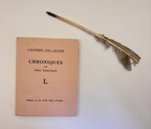 LEAUTAUD Paul : Chroniques. A la cité des livres Paris 1925. E.O. L'un des ex. H.C. sur Arches. Envoi à Mlle BLAIZOT. Broché in-12, très bel état. Jointe un plume d'oie ayant appartenue à Léautaud et qui fut donnée à Mlle Blaizot par Marie...
