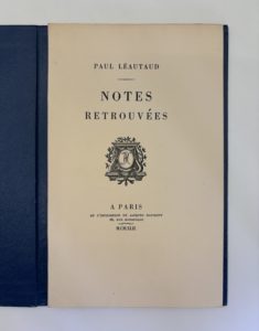 LEAUTAUD Paul : Notes retrouvées. Imprimerie Haumont Paris 1942. E.O. L'un des 40 ex. sur papier bouffant. Envoi à Jean LOIZE. Broché in-12 sous chemise et étui plein papier bleu.