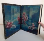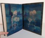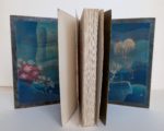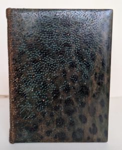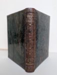 chacun des plats, ce papier est poinçonné d'un ensemble de pointillés laissant apparaître en dessous un papier vert plus clair, dos à deux nerfs assombris, lettrines or, tête dorée, étui de toile de jute, couverture et dos conservés, intérieur frais.