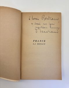 MORAND Paul : Lot de 4 E.O. France la doulce. Gallimard Paris 1934. Ex. en S.P. Envoi à l'historien Louis BERTRAND. Broché in-12, dos jauni / Apprendre à sa reposer. Flammarion Paris 1937 (pas de grand papier). Plaquette in-12 / Mes débuts. Ed....