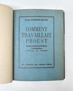 QUINT Léon-Pierre : Comment travaillait Proust. Bibliographie. Variantes. Lettres de Proust. Aux éditions des cahiers libres Paris 1928. Edition originale. Tirage limité à 830 exemplaires, l'un des 30 ex. de tête sur Hollande, le n°XIV. Reliure...