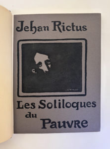 RICTUS Jehan : Les soliloques du pauvre. Chez l'auteur Paris 1897. Véritable E.O. publié à compte d'auteur (l'un des 500 ex. sur vélin). Très bel envoi autographe signé à Monsieur ANTHONY'S. Bien complet des deux lithographies en noir de...