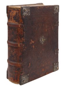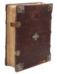Spire, Peter Drach, 26 février 1483. In-folio goth. à 2 colonnes de 48 lignes, veau fauve estampé sur ais de bois, cornières, ombilic central et fermoirs métalliques (Reliure de l'époque).Seconde édition de cet important commentaire scolastique sur le Livre de la Sagesse.