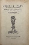 Bâle, Johann Herwagen, 1535. 2 tomes en un volume in-folio, peau de truie estampée à froid sur ais de bois, fermoirs métalliques, tranches rouges (Reliure de l'époque).Édition grecque de l'Iliade et l'Odyssée sorties des presses de Johann Herwagen, dont la marque est imprimée sur le titre et au dernier feuillet de chaque tome.