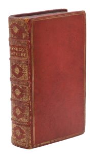 Paris, Samuel Thiboust, 1623. 2 parties en un volume in-8, maroquin rouge, double filet doré, dos orné, tranches jaspées (Reliure du XVIIe siècle).Première édition illustrée de la traduction de Jean de Montlyard, qui respecta scrupuleusement les nombreuses hardiesses du texte original, retranchées par les traducteurs suivants. L'édition se termine par un volumineux Commentaire sur l'ouvrage sous pagination séparée.