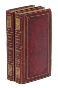 Amsterdam, Daniel Elzevier ; Paris, Thomas Jolly, 1678. 2 volumes in-24, maroquin violet, double filet doré et roulette à froid, dos lisse orné, triple filet intérieur, tranches dorées (Purgold-Hering).Charmante édition elzévirienne ornée d'un titre-frontispice (ici en tête du second volume), d'un portrait en buste du Tasse et de 20 planches non signées, dues à Sébastien Leclerc.