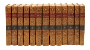 1792-1802. 13 volumes in-8, veau raciné, roulette de feuilles de chêne dorée, dos lisse orné, tranches mouchetées (Reliure de l'époque).Exceptionnelle collection de cette description méthodique de la France, département par département, entreprise deux ans après leur création par l'Assemblée constituante. Le texte en fut rédigé par Joseph Lavallée et Jean-Baptiste-Joseph Breton, tandis que Louis Brion de la Tour se chargeait de l'illustration, et son père, des cartes géographiques.