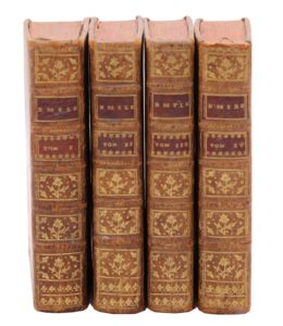 1762. 4 volumes in-12, veau fauve, triple filet doré, dos orné, tranches rouges (Reliure de l'époque).Édition originale de cette œuvre majeure dans laquelle Rousseau expose les principes d'une éducation naturelle.