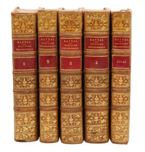Genève, Jean-Léonard Pellet, 1780. 5 volumes in-4, veau fauve, triple filet doré, dos orné, dentelle intérieure, tranches dorées (Reliure de l'époque).Troisième et meilleure édition, en partie originale, du chef-d'œuvre de l'abbé Raynal.